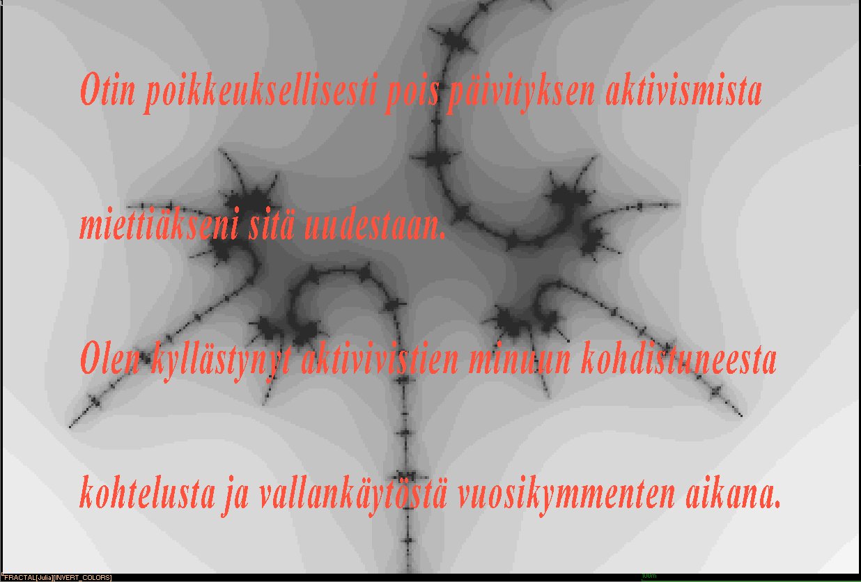 ”Yksien totuuksien” voimistumista ei voi hillitä huonolla yleissivistyksellä vain väittämällä vastaan opposition riveissä tai mielenosoituksissa. Heikko yleisnäkemys edistää ideologista poterointia ja salaliittoarvailuja. Putin, Israel, Unkarit, Trumpit ovat psykologinen ilmiö, joka kopioi itsensä eteenpäin ehkä Macroniksi tai Stubbiksi. Ja miettikää, antifasistit ynnä muut moraalisesti ylivertaiset, onko ilmiö jo kopioitunut teihinkin.