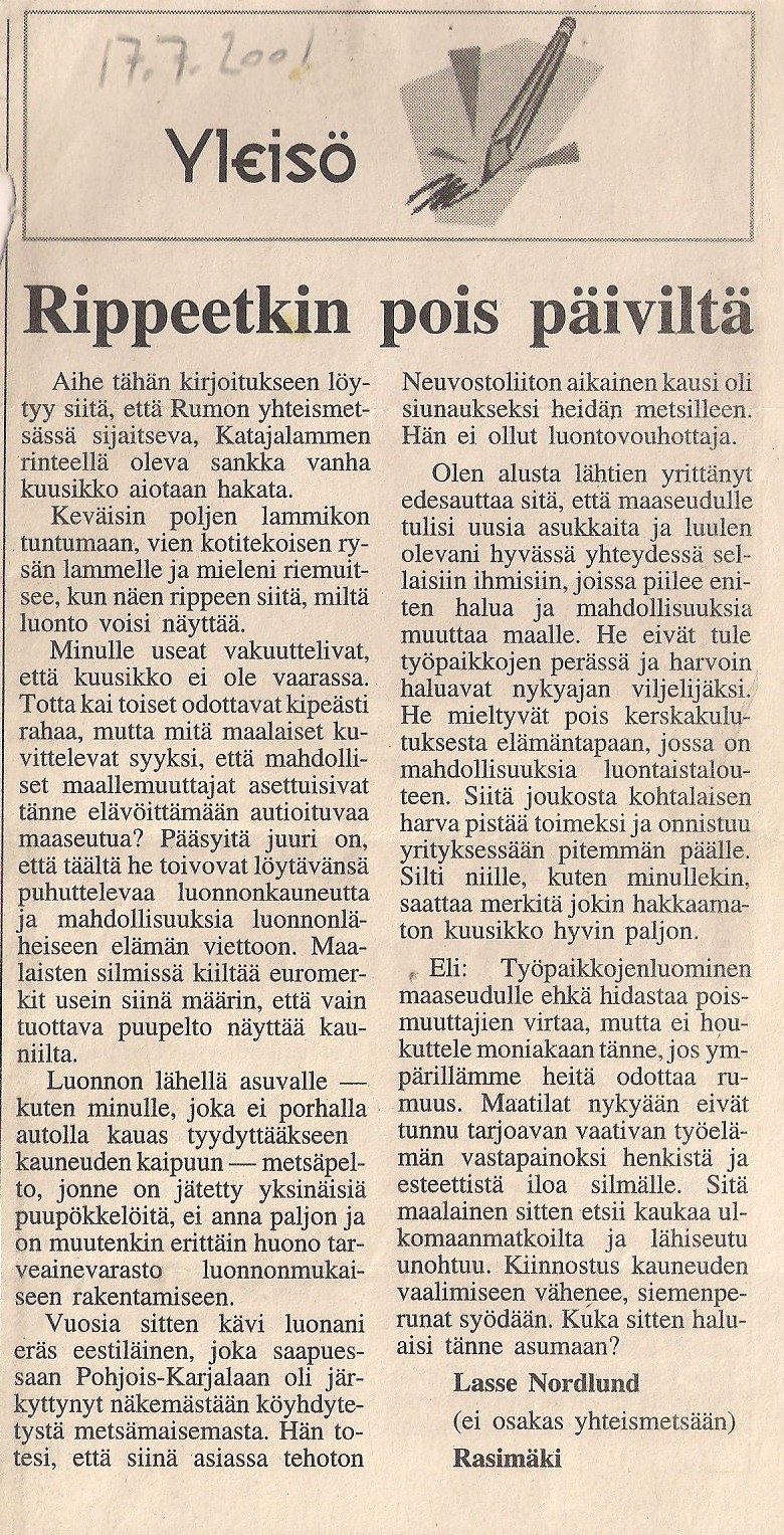 Sananvaihdon kaava oli aika tyypillinen. Myrsky syntyi, kesti aikansa ja tasoittui. Ainakin yksi asia tuli koetuksi: maaseudullakin voi ilmaista itseään. Helppoa se ei ole, mutta erimielisyyttä ei voi paeta niin helposti kuin kaupungeissa. Se voi olla syy, jonka vuoksi kannattaa harkita viestinsä tyyliä. Keskustelun taso ja asetelma ei ole kuitenkaan muuttunut olennaisesti. Poikkeava kanta saa vähättelevän vastaanoton. Pinnan alla tapahtui enemmän eikä leiriytyminen ollut niin selkeä kuin olisi voinut kuvitella. Kirjoittelu sävähdytti, koska se kuitenkin koski jollain tapaa yhteistä sieluamme.